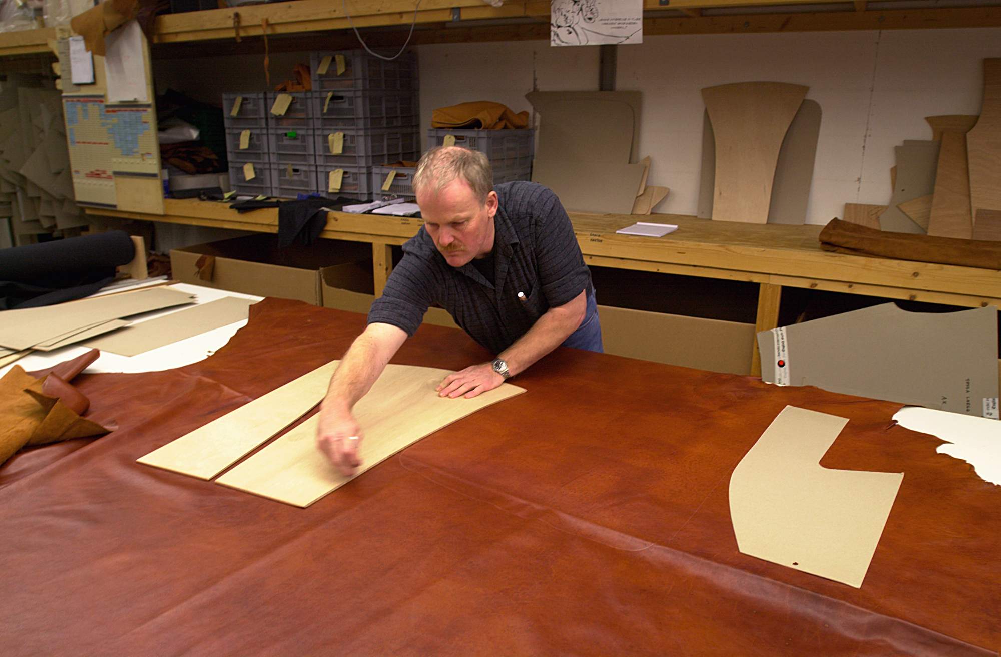 Jede Lederhaut wird schon beim Einkauf auf Fehler hin kontrolliert. Die Häute werden mit Hilfe von Schablonen per Hand zugeschnitten, so dass möglichst wenig Material verschwendet wird und die Schönheit des Leders zum Vorschein kommt.