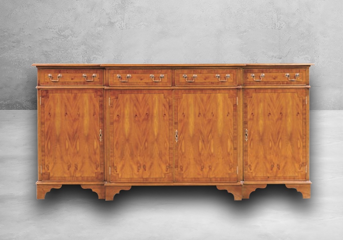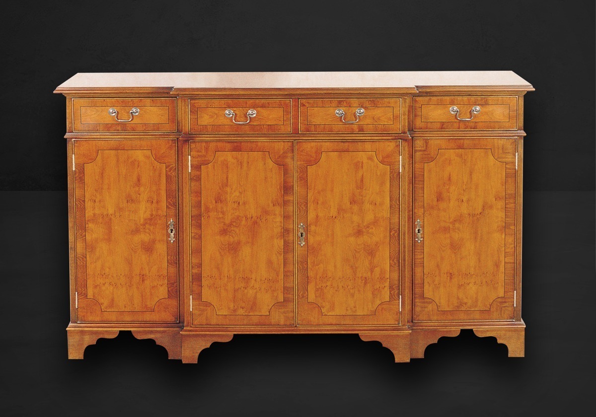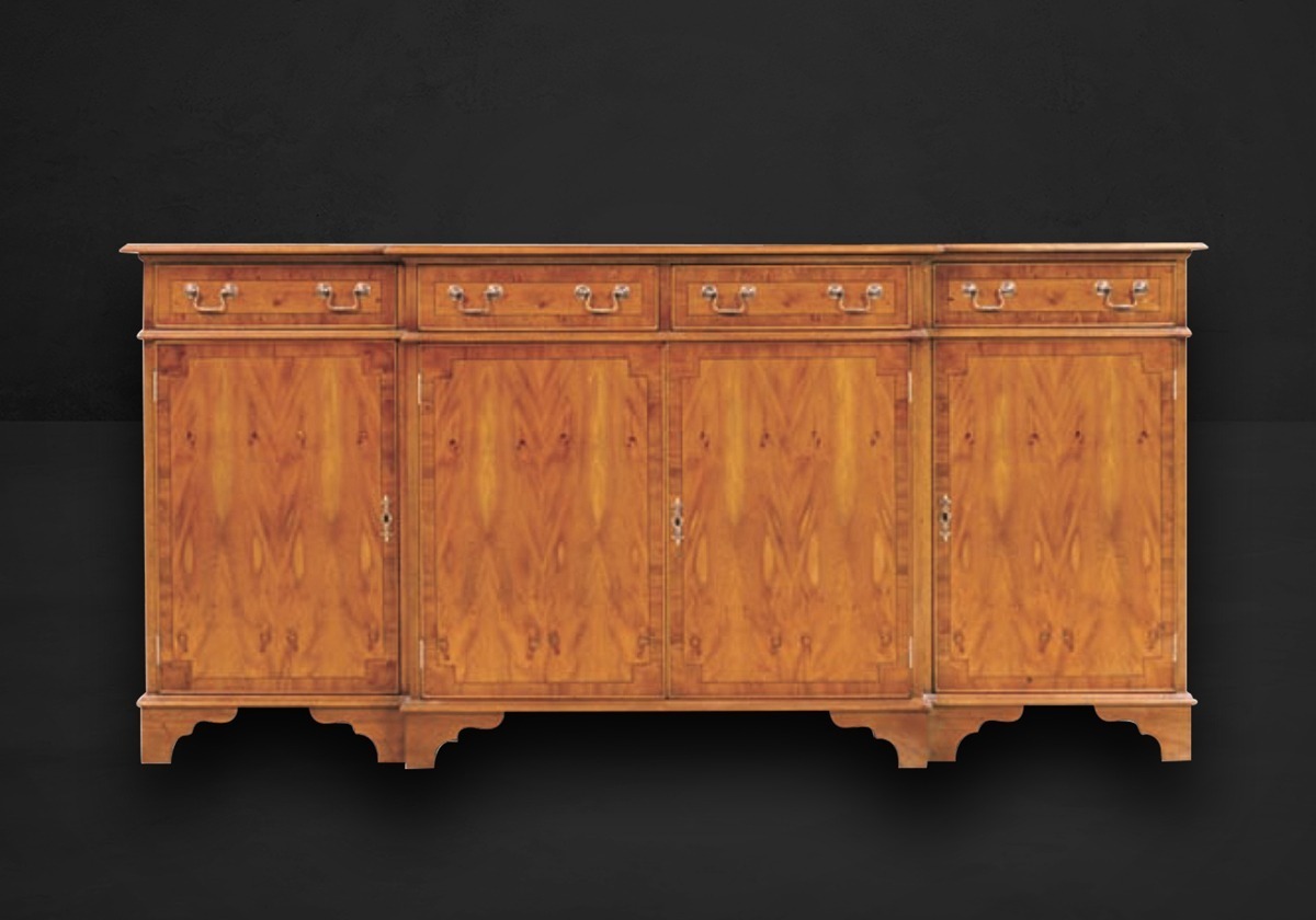 Das Sideboard ist wahlweise mit ausgesuchten Furnieren in Mahagoni oder Eibe und in zwei Größen bestellbar. Die Türen und Schubladen der 4-türigen Anrichte haben zum Rand hin eine Intarsie und ein Querfurnier bekommen – die Schubladen sind mit Schwanenhalsgriffen ausgestattet – diese Bezeichnung haben sie wegen ihrer Form bekommen. Die Manufaktur im Süden von England ist darauf spezialisiert, klassische englische Stilmöbel in hervorragender Qualität herzustellen.