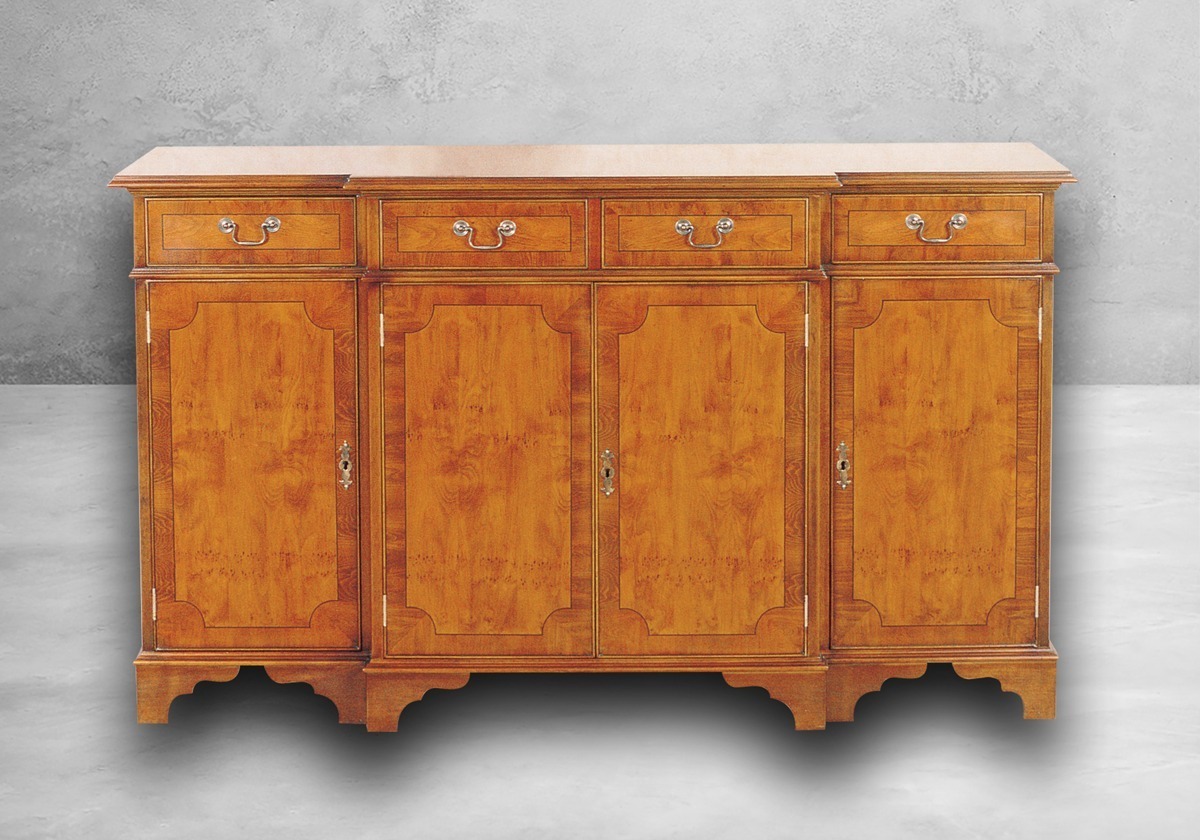 In das 4-türige Breakfront Sideboard passt alles, was im Esszimmer benötigt wird: Geschirr, das gute Besteck, Vasen und Tischdecken finden hier ihren Platz. In den Schubladen wird zusätzlich auch noch anderes Zubehör sortiert – dazu steht optional eine Besteckschublade zur Verfügung. Hinter den abschließbaren Türen befindet sich ein großer Einlegeboden hinter den beiden Flügeltüren in der Mitte und ein Boden jeweils rechts und links – der Sockel ist offen und dadurch leicht gestaltet. Die 4-türige Anrichte komplettiert das englische Esszimmer und setzt mit dem vorgezogenen Mittelteil – der Breakfront – ein Highlight.