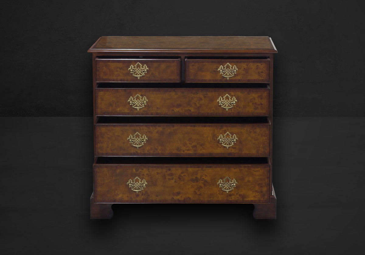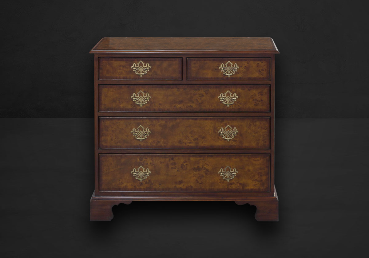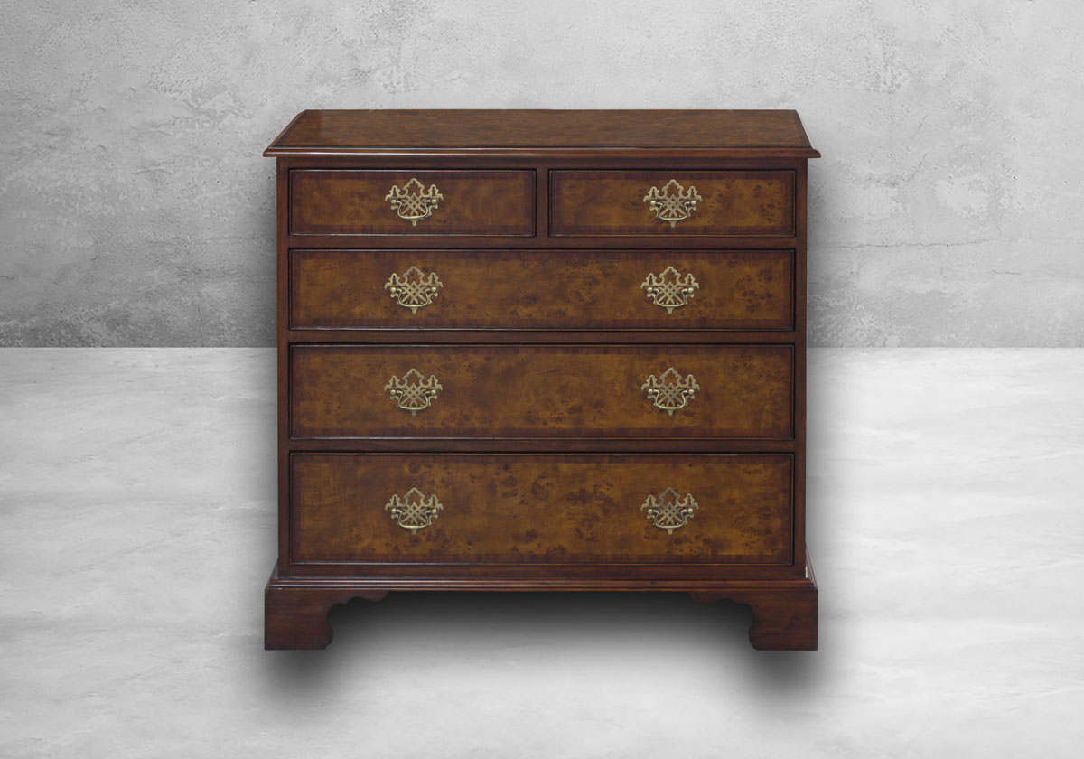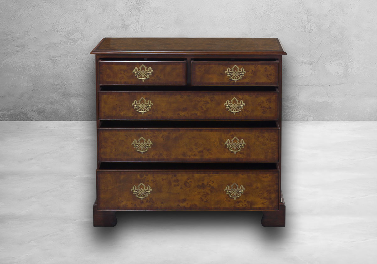 Ein Blickfang im Wohnzimmer oder als Ablage im Eingangsbereich – Kommoden sind wahrhafte Schmuckstücke im Haus und helfen bei der Unterbringung diverser Gegenstände. Eine Lampe, dekoriert auf der Oberfläche der Kommode bringt den gesamten Raum zum Leuchten. Die Kommode English Burl mit gerader Front – Straight Front – verfügt über fünf Schubladen und steht auf einem offenen Sockel. In der oberen Reihe befinden sich zwei kleine Schübe darunter sind weitere drei Schubladen als Waterfall eingebaut, also nach unten hin größer werdend. Typisch für die Kommode sind die Griffe aus massivem Messing an den Schubladen: Der Form wegen werden sie Schwanenhalsgriffe genannt. Zur perfekten Gestaltung des Wohnraums gehört eine stilvolle Kommode auf jeden Fall dazu.
