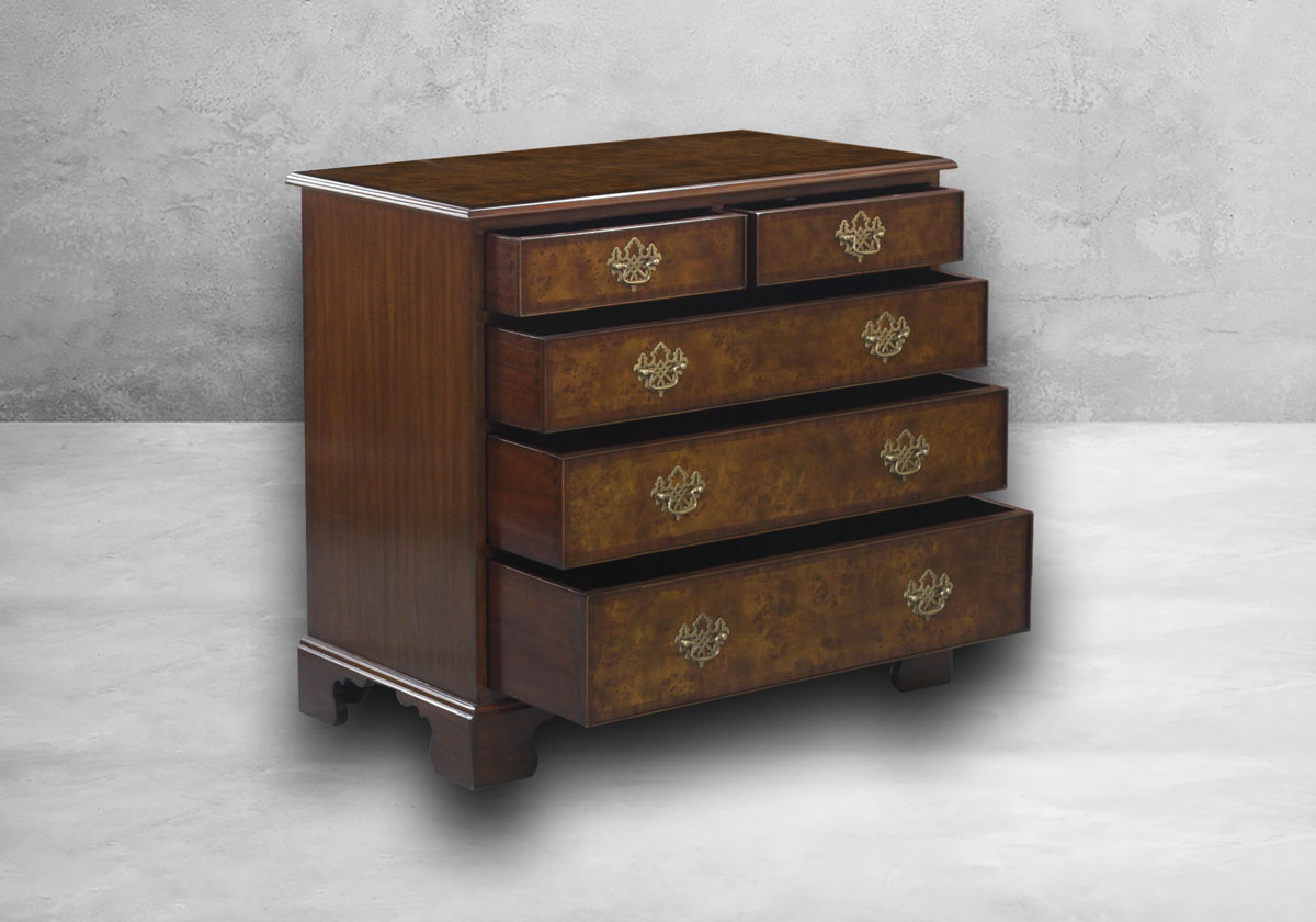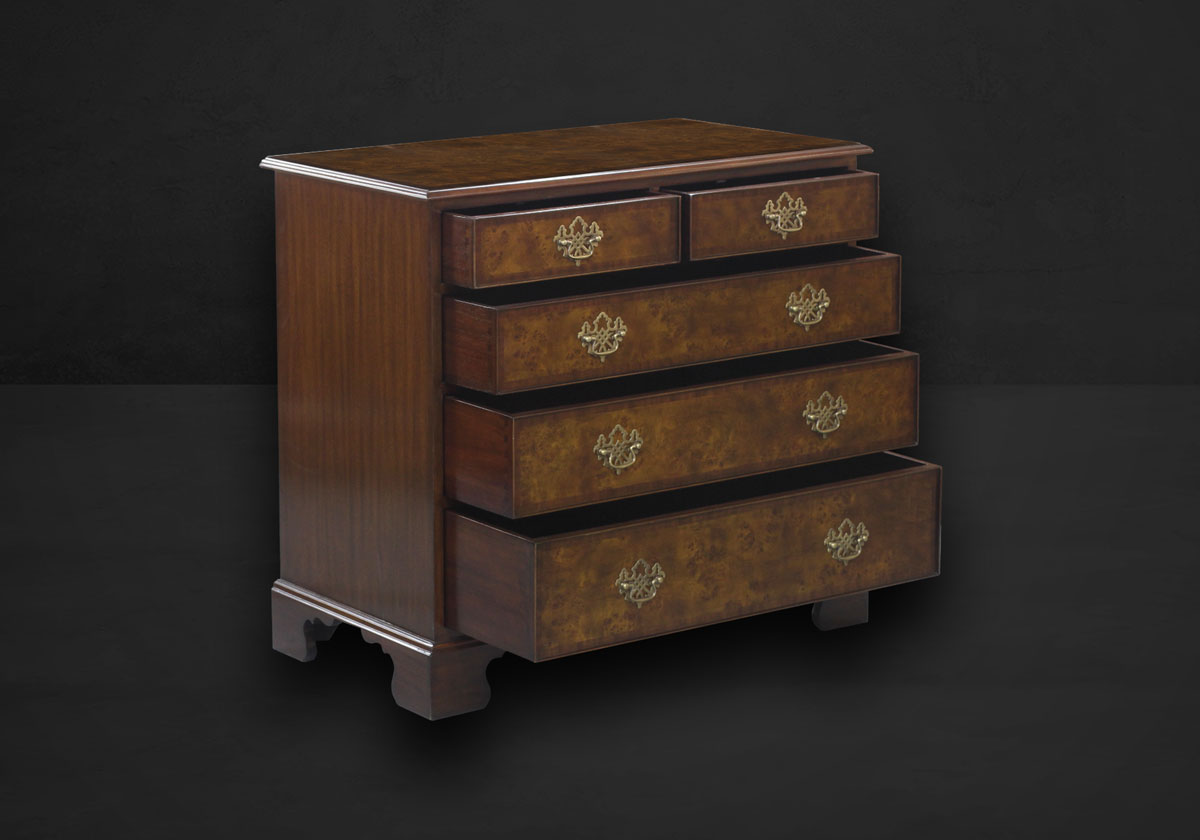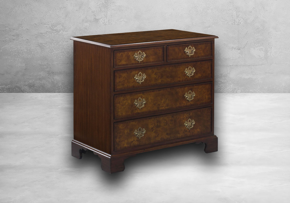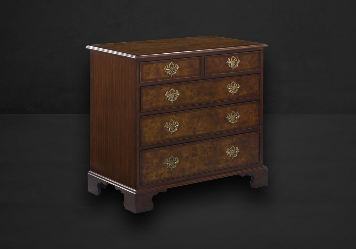 Ein Blickfang im Wohnzimmer oder als Ablage im Eingangsbereich – Kommoden sind wahrhafte Schmuckstücke im Haus und helfen bei der Unterbringung diverser Gegenstände. Eine Lampe, dekoriert auf der Oberfläche der Kommode bringt den gesamten Raum zum Leuchten. Die Kommode English Burl mit gerader Front – Straight Front – verfügt über fünf Schubladen und steht auf einem offenen Sockel. In der oberen Reihe befinden sich zwei kleine Schübe darunter sind weitere drei Schubladen als Waterfall eingebaut, also nach unten hin größer werdend. Typisch für die Kommode sind die Griffe aus massivem Messing an den Schubladen: Der Form wegen werden sie Schwanenhalsgriffe genannt. Zur perfekten Gestaltung des Wohnraums gehört eine stilvolle Kommode auf jeden Fall dazu.