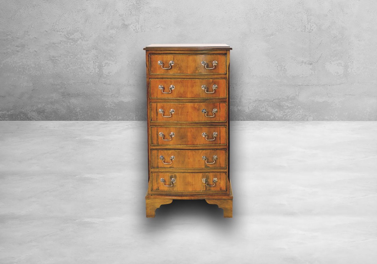 Die Serpentinen Kommode TA7 wird wahlweise mit einem ausgesuchten Mahagoni- oder Eibefurnier in England handwerklich hergestellt – die Kommode hat zum Rand hin eine farblich abgesetzte Intarsie und ist nach außen hin querfurniert. Hochwertige Messingbeschläge verzieren die vier Schubladen. Die Manufaktur im Süden von England – nicht weit von London entfernt – ist darauf spezialisiert, klassische englische Stilmöbel herzustellen.