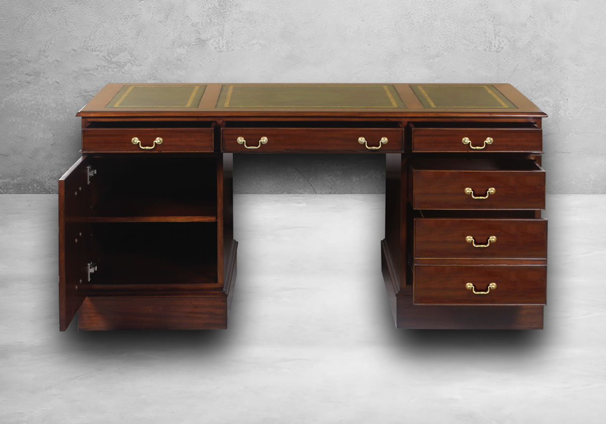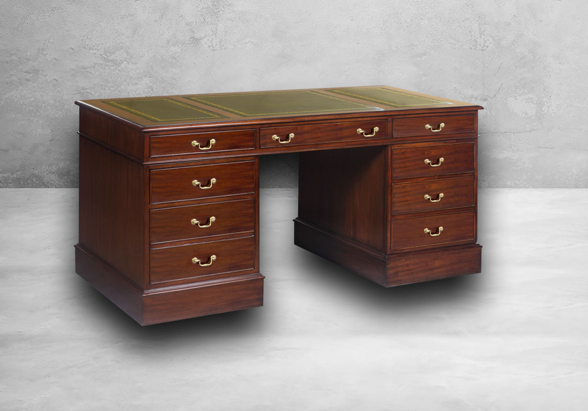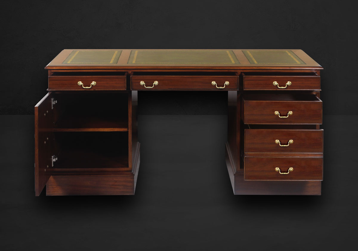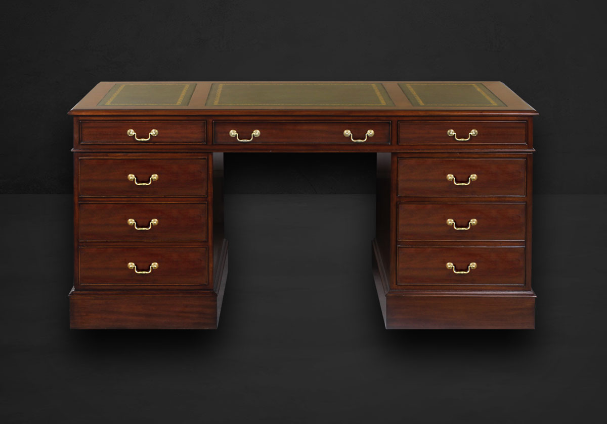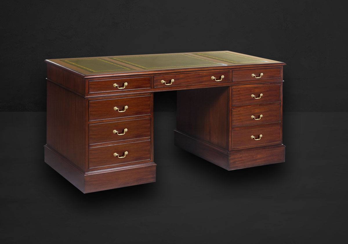 Der Schreibtisch in Mahagoni, der English Pedestal Desk, darf in keinem Homeoffice oder im stilvollen Büro fehlen. Die typischen Details des Desk sind leicht zu erkennen: Die Schreibplatte ist mit feinem echtem Leder bezogen und zum Rand hin geprägt und mit echtem Blattgold verziert. Hierfür stehen verschiedene Lederfarben zur Verfügung. Zwei Schubladen Kontainer mit drei Laden bzw. einer Tür dienen gleichzeitig als Auflage für die Schreibplatte, die ihrerseits noch einmal mit drei Schüben ausgestattet ist – genug Platz um alle Utensilien zu verstauen. Da macht das Arbeiten viel mehr Freude!