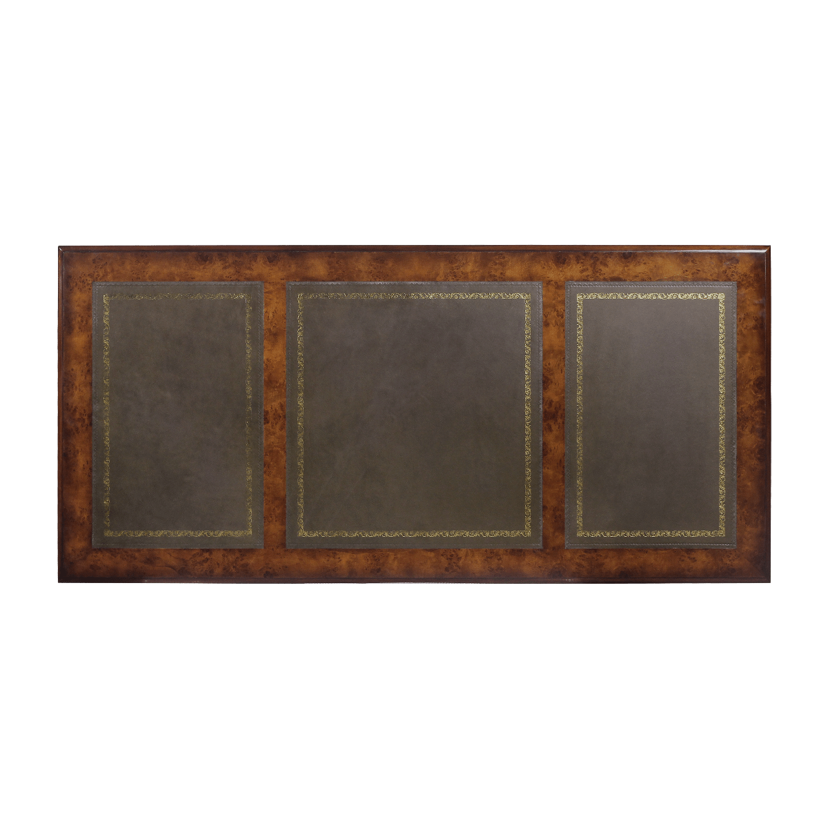 Der Schreibtisch in Mahagoni wird in verschiedenen Farbtönen hergestellt und ist mit unterschiedlichen Lederfarben bestellbar. Die beiden Sockel sind geschlossen – die Seiten- und Rückwände schlicht gehalten. Ein Kontainer ist mit drei Schubladen bestückt der andere Kontainer ist mit einer Tür ausgestattet. Typisch sind die Messinggriffe an den Schubladen: Der Form wegen werden sie Schwanenhals Griffe genannt.