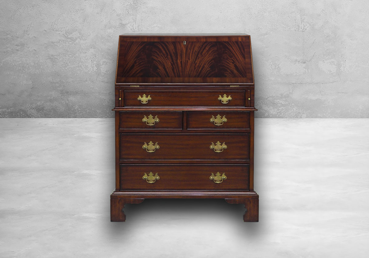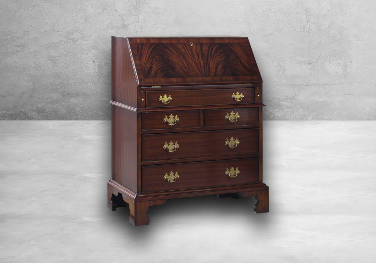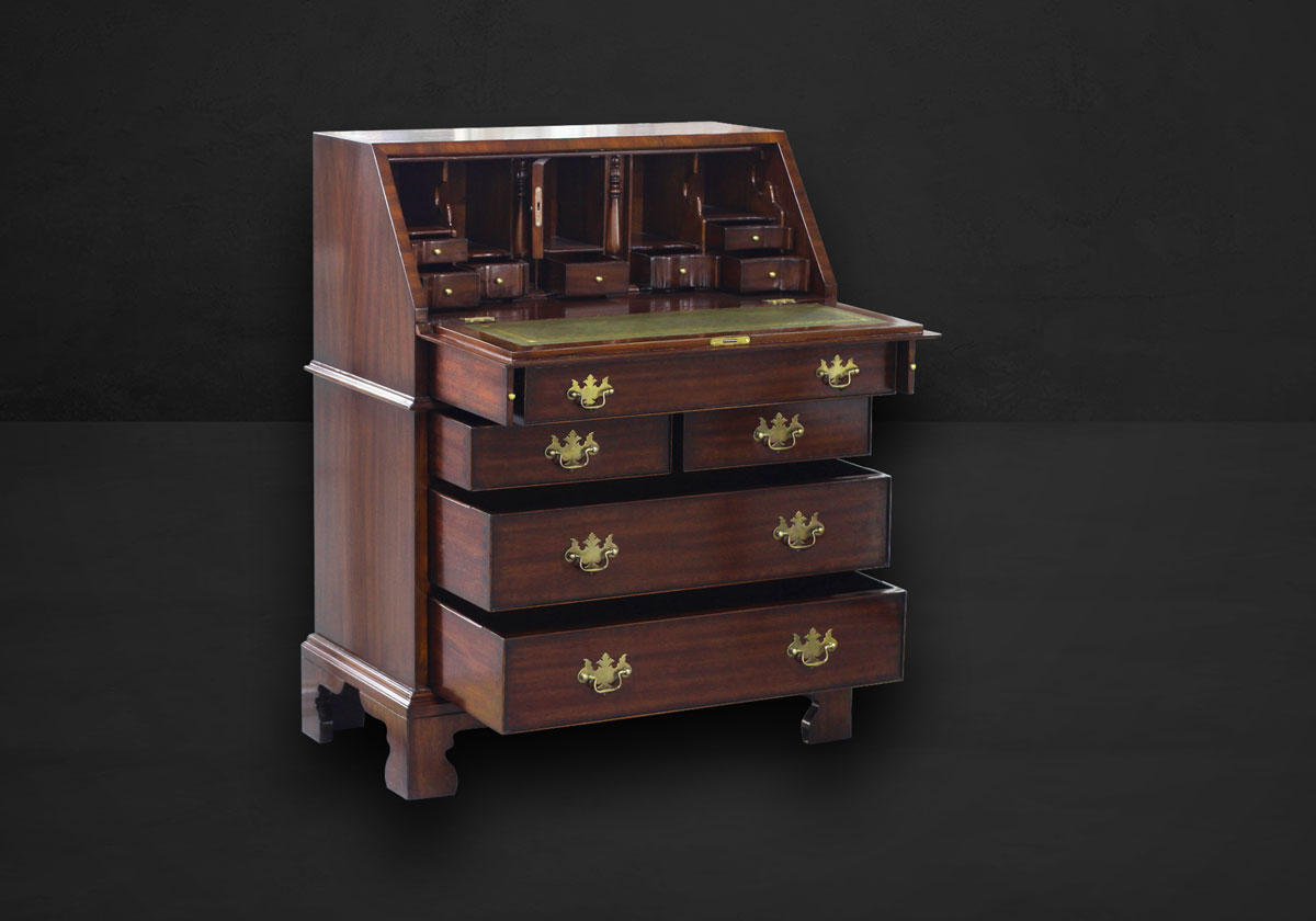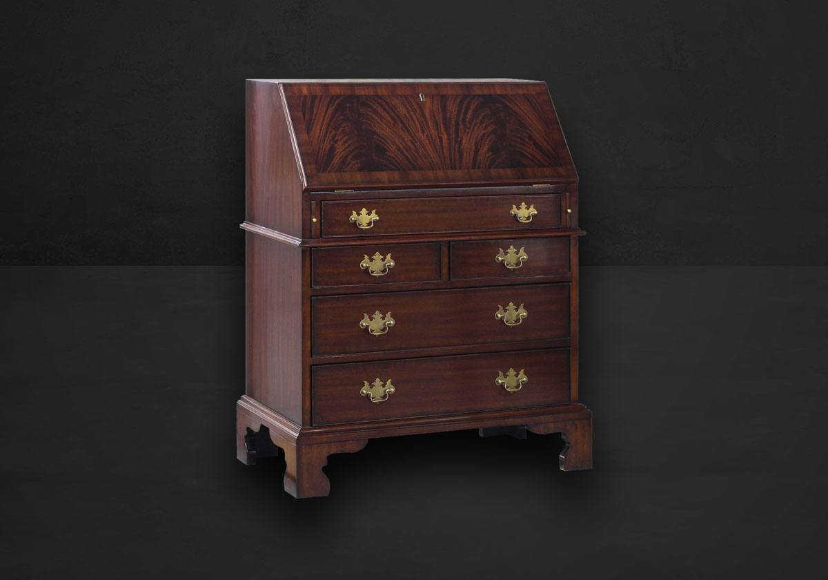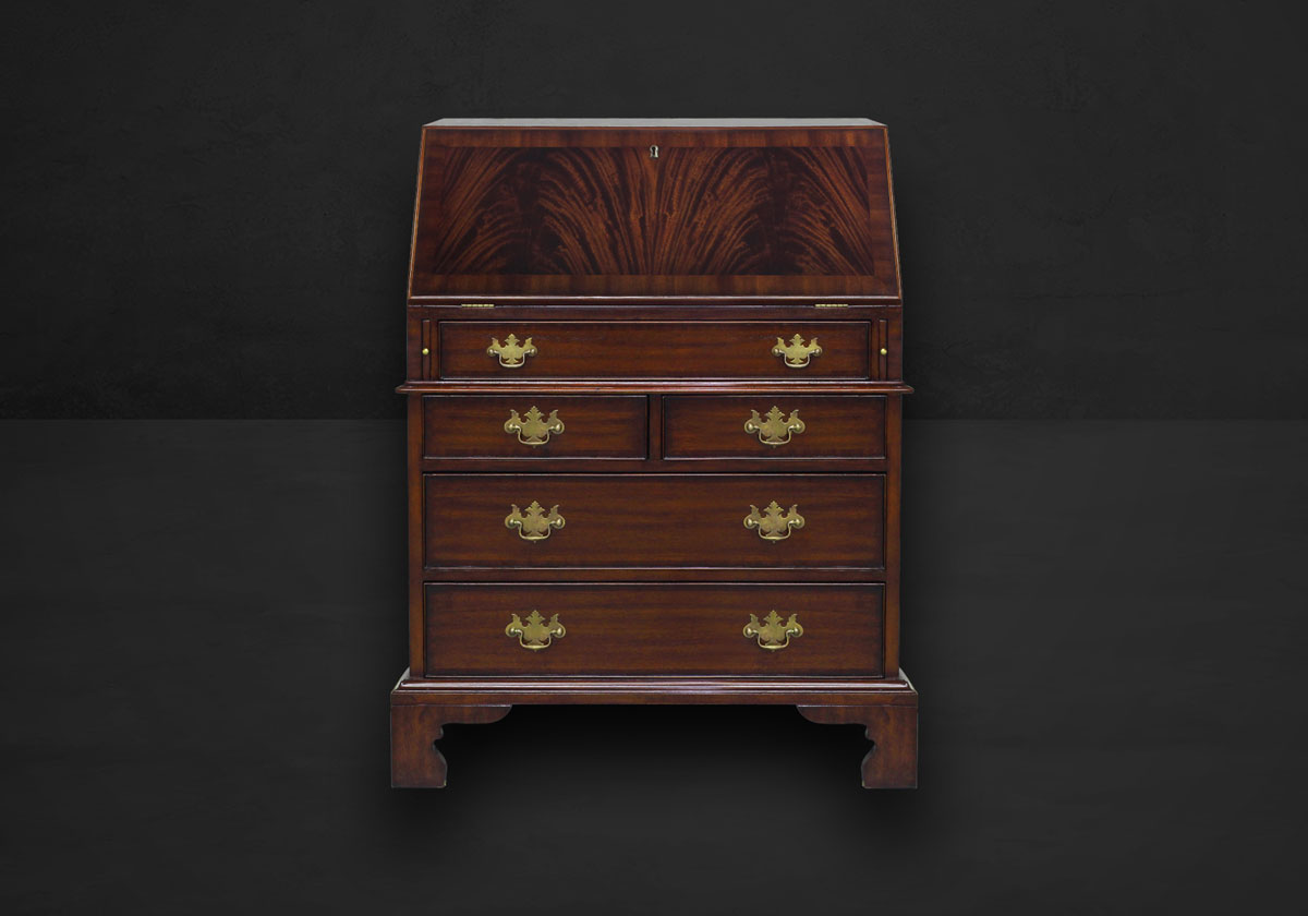 Dieser Sekretär wird in massivem Mahagoni hergestellt und ist mit unterschiedlichen Holz- und Lederfarben bestellbar. Die fünf „Waterfall Drawers“- die nach oben schmaler werdenden Schubladen – zusammen mit den typischen Schwanenhals Griffen mit ausgesägten Messingplatten bestimmen das Erscheinungsbild des Sekretärs. Mit seinem offenen Sockel erscheint er sehr leicht und hinterlässt schlichte Eleganz.