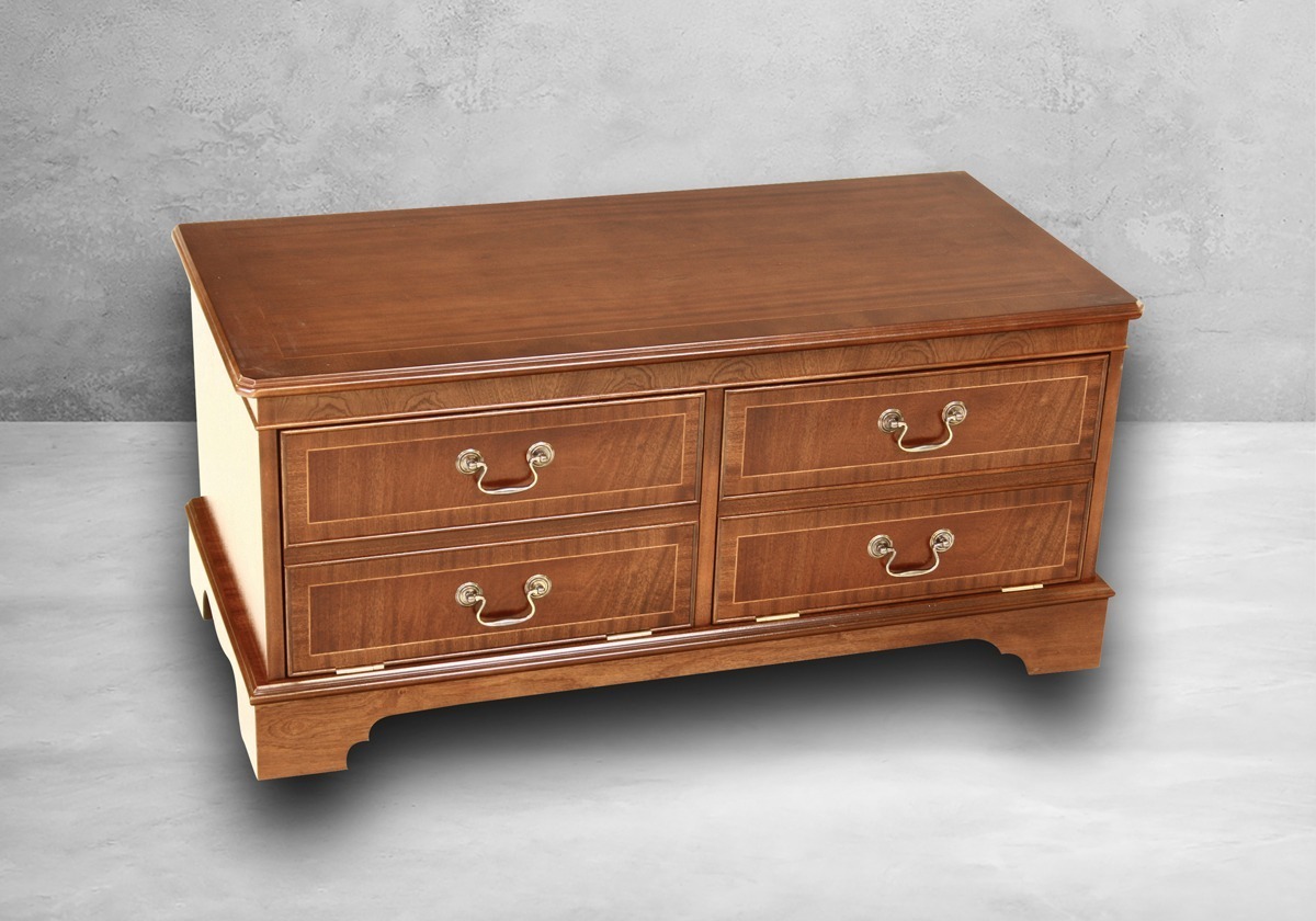 Der TV Tisch TV2 wird wahlweise mit einem ausgesuchten Mahagoni- oder Eibefurnier in England handwerklich hergestellt – der Tisch hat zum Rand hin eine farblich abgesetzte Intarsie und ist nach Außen hin querfurniert. Die Manufaktur im Süden von England – nicht weit von London entfernt – ist darauf spezialisiert, klassische englische Stilmöbel herzustellen. Der TV Tisch TV2 gibt modernen technischen Geräten ein stilvolles Zuhause.